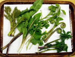 春らしくなって、近くの山にはたくさん山菜が出ています、 6月末まで採れたての山菜のお料理が楽しめます。 是非、この時期限定のわさびそば山菜そばをご賞味ください。 (左から タラの芽/カタクリ/エラクサ/わさびの原種/ぜんまい/モミジがさ)